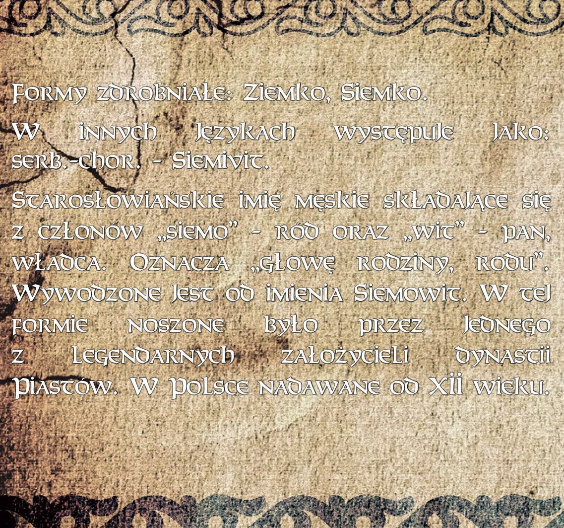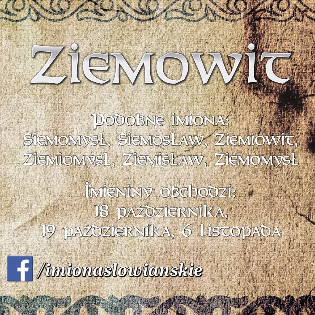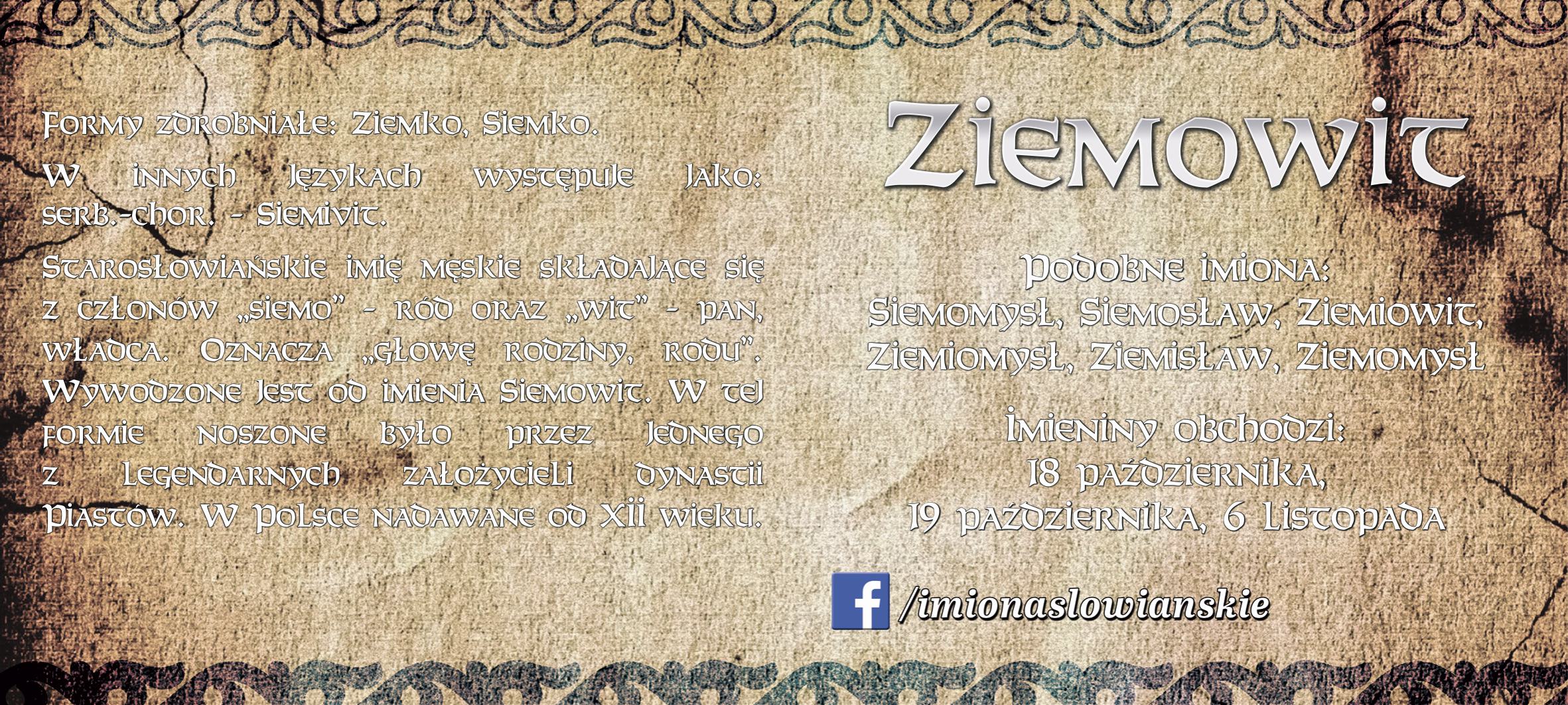 Zawiera nadruk z imieniem Ziemowit, zbliżone imiona słowiańskie, daty imienin, wyjaśnienie znaczenia imienia oraz ciekawe informacje.